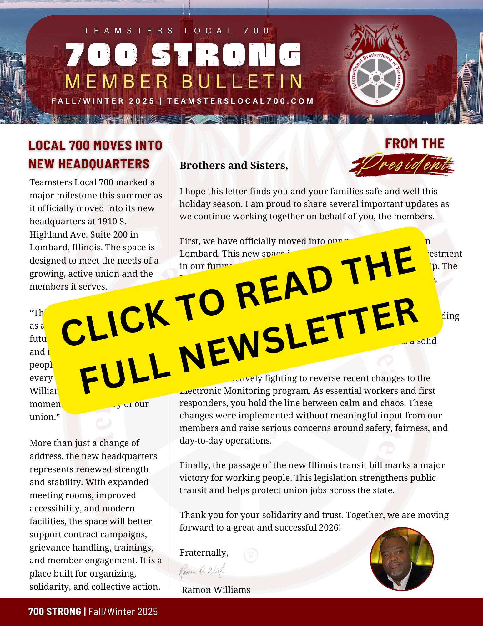 Day in and day out, your union is advocating for you at work and beyond. The latest edition of the 700 Strong newsletter, linked below, showcases the momentum we’re building together—featuring recent contract victories, organizing updates, member highlights, and opportunities to get involved. Our strength comes from an active, informed membership standing shoulder to shoulder, and that begins with staying connected to the work we’re doing.