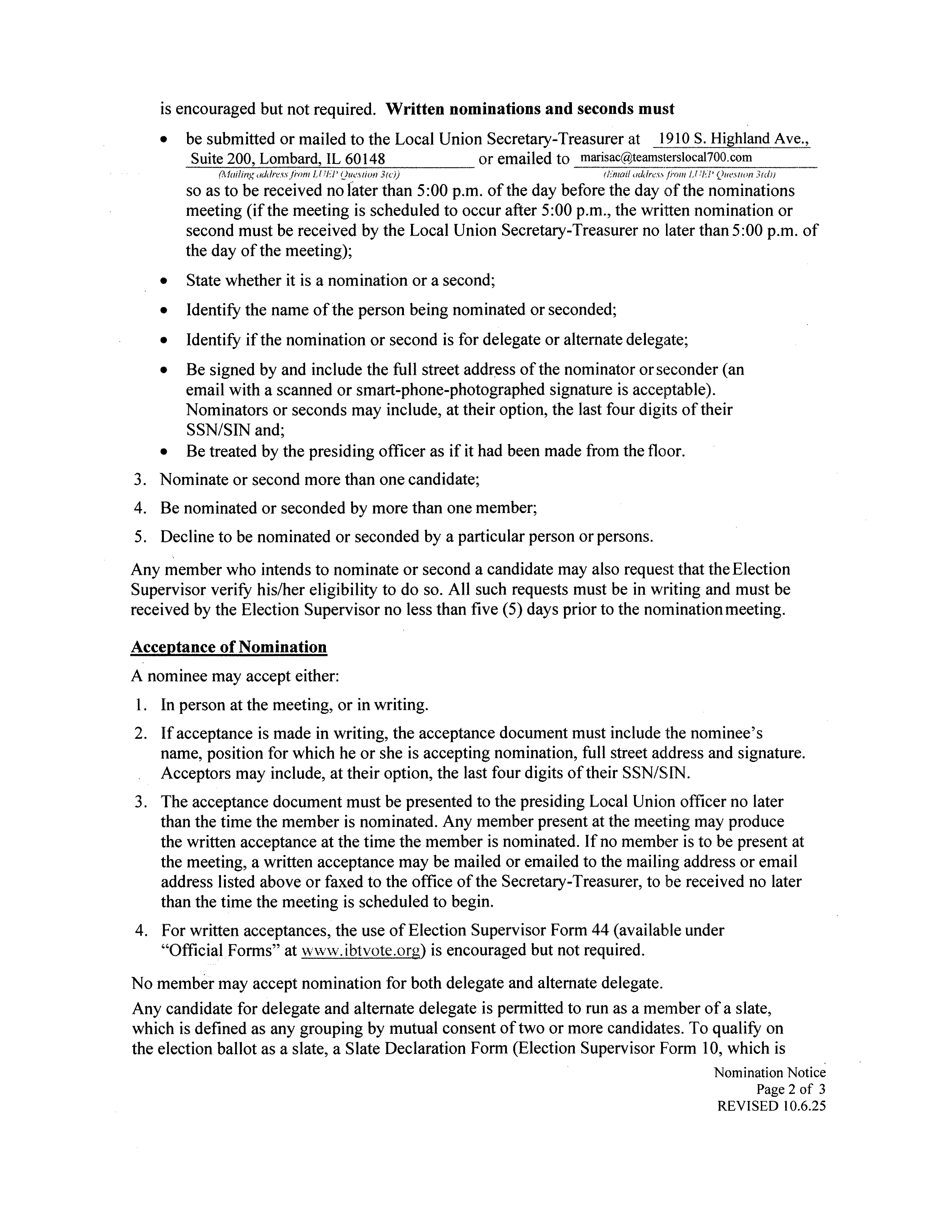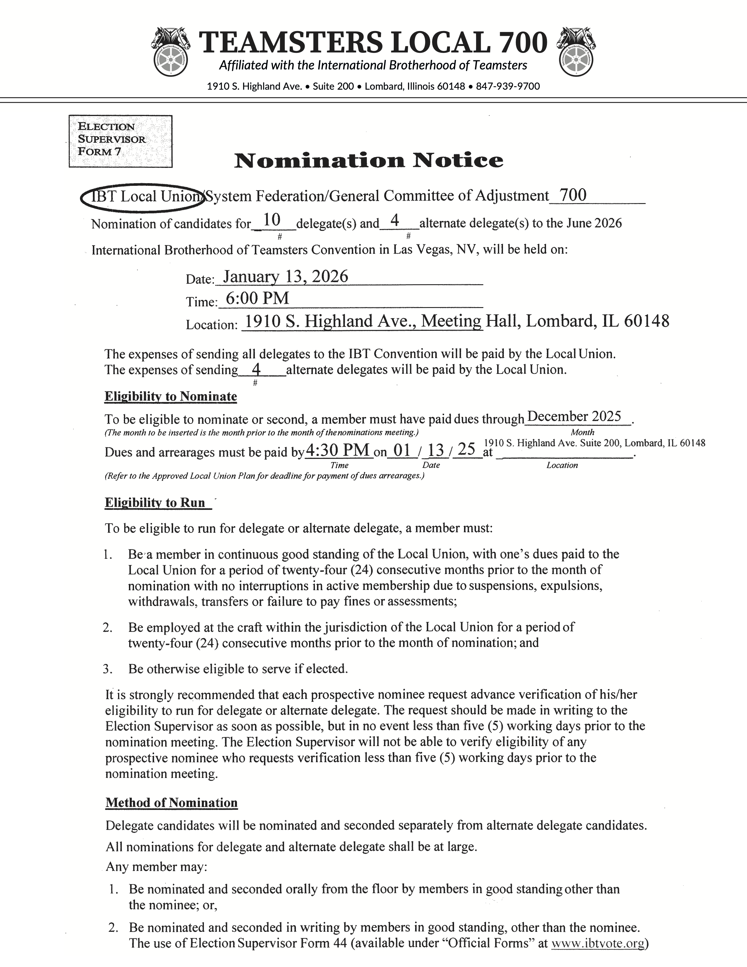 Teamsters Local 700 Meeting Hall 1910 S Highland Ave. Lombard, IL 60148