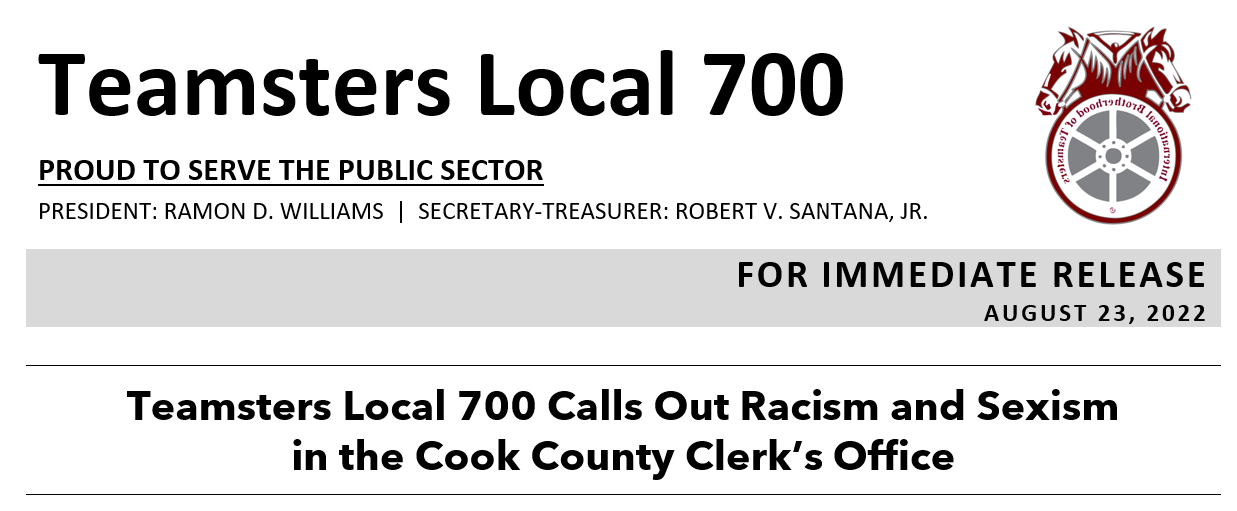 COOK COUNTY, IL – Teamsters Local 700 has been made aware of racist and sexist comments made by at least one supervisor at the Cook County Clerk’s Office that we must immediately address.